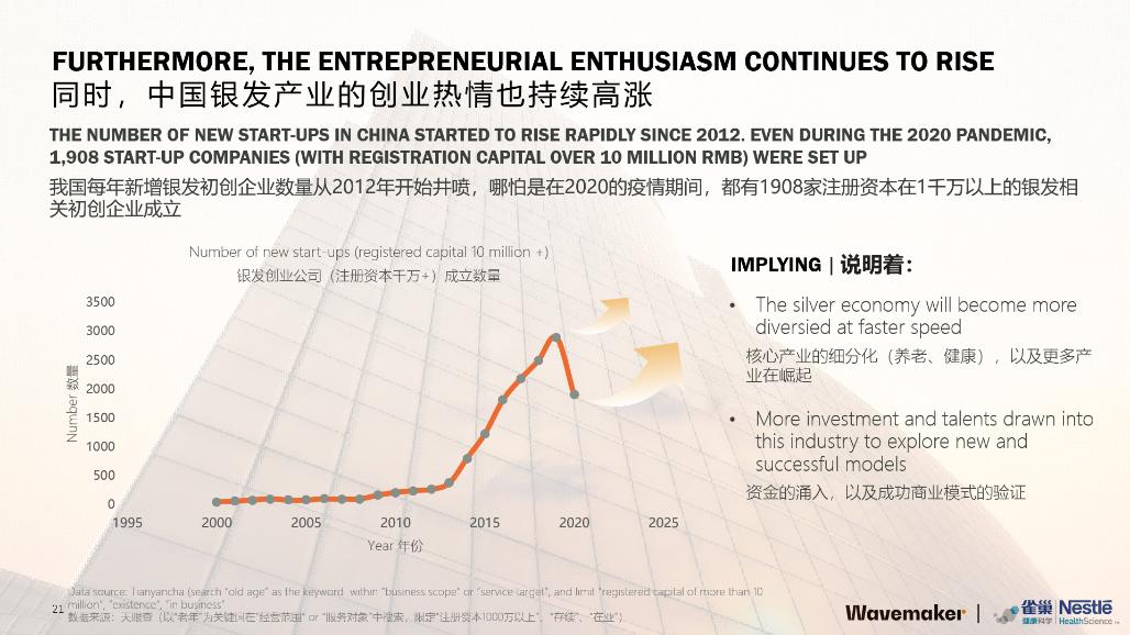 一场突然其来的新冠肺炎疫情,让很多行业都受到了重创挑战,公众的健康观念也随之上升到了新的高点。通过对中国一至三线城市三代银发族的调查显示,在“健康中国“战略”和中国特有优势的作用下,整个银发产业呈现出蓬勃发展的势头。中国银发产业在政策趋势、产业结构、推动力方面呈现出三大变化。此外,2020年新增注册资本在千万人民以上的银发产业相关的初创公司数量达到1900多家。2021注定成为中国银发产业发展里程碑式的起点。