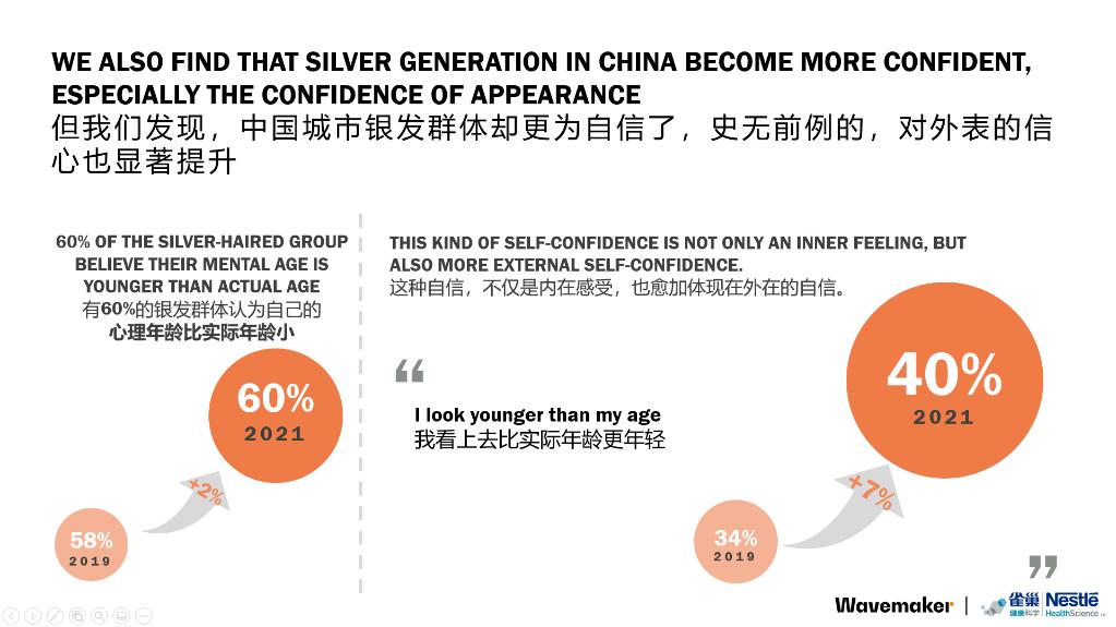 报告表明,“中国银发群体2.0”,他们更享受生活也更注重自我,展现出更多自信。40%的银发群体认为他们看起来比实际年轻,占比较2019年上涨7%。他们更在意形象上的投入,有近八成的女性在皮肤管理或个人形象上有所投入,男性银发族也近半数。