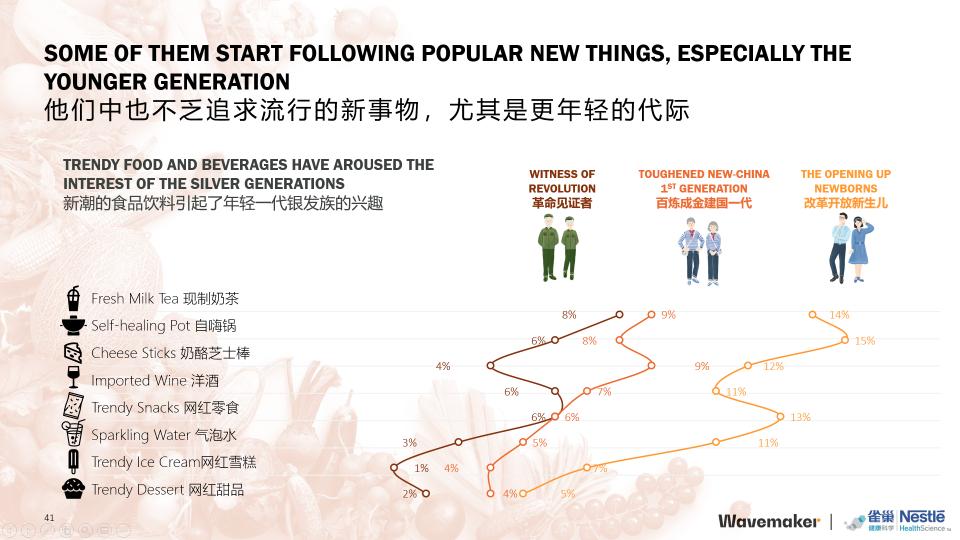 有近半数的银发群体表示,不为退休生活所焦虑,这一改变是史无前例的。94%的银发群体表示,不论现阶段退休与否,都对退休生活心存期待。他们消费更加自我,自主决策的能力有了进一步提升。消费观念的解放让他们更加意识到经济的重要性,追求更高的物质生活。88%认为金钱很重要,可以带来更好的生活;87%认为享受生活是第一位,尤其是现在更要享受生活。他们中也不乏追求流行的新事物,尤其是更年轻的代际。新潮的食品饮料引起了年轻一代银发族的兴趣。