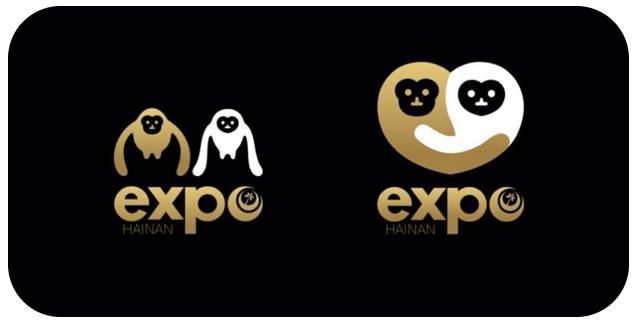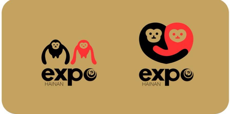 吉祥物主标志由两只海南长臂猿组成。根据海南长臂猿的实际颜色特点,母猿“元元”,实际颜色黄色,故设计成黄色,公猿“宵宵”,实际颜色黑色,故设计成灰黑色。两只海南长臂猿拥抱成爱心的形状,在爱心中以椰子树来体现海南特色。吉祥物在主设计的基础上进行延展与深化,可根据不同的场景与消博会标识等组合使用。