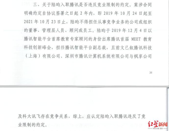 陆昀于2019年12月4日以腾讯智能平台首席教育专家顾问的身份出席腾讯首届MEET教育科技创新峰会,担任腾讯智能平台副总裁,应认定陆昀入职腾讯违反了竞业限制的约定。