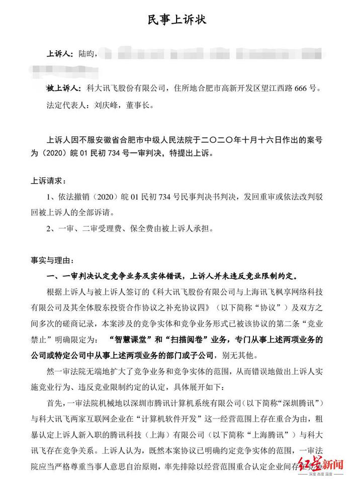 科大讯飞表示,之后,陆昀又多次以腾讯智能平台副总裁、腾讯教育应用平台总经理身份,出席各类活动。陆昀全面掌握枫享公司最核心的经营信息和商业秘密,离职即到与原告存在明显业务竞争关系的实体担任专家顾问及总经理职务,违反了收购协议竞业限制的约定。