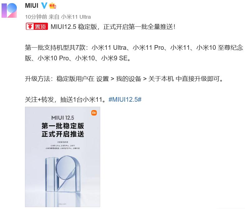 4月22日,小米MIUI官方微博发布消息“MIUI12.5稳定版,正式开启第一批全量推送!第一批支持机型共7款:小米11Ultra、小米11Pro、小米11、小米10至尊纪念版、小米10Pro、小米10、小米9SE。” 值得一提的是,小米11Ultra和小米11Pro提前进入到首批机型中,给米粉带来了意外惊喜。