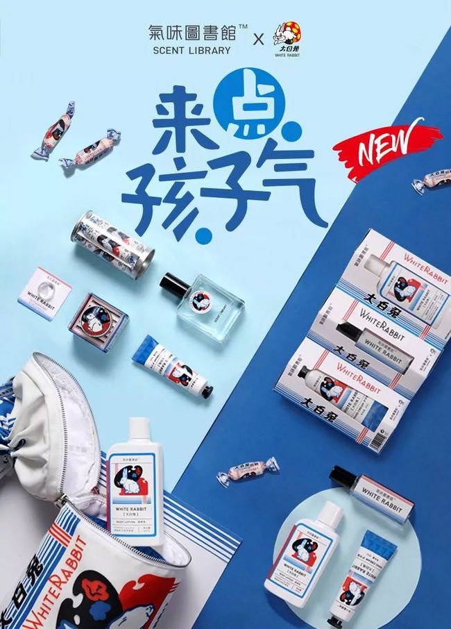2019年5月,大白兔与气味图书馆携手,推出了快乐童年香氛系列产品,包括大白兔奶糖香水、沐浴露、身体乳、护手霜和车载香氛,还有大白兔奶糖plus版的帆布包,每一款都深受消费者的追捧。除了单纯的跨界联合,大白兔对时尚圈也“虎视眈眈”,大白兔在“be ANOTHER 无乐不作”LEDIN 2019 时装秀中,首次与服装品牌LEDIN携手,共同推出联名潮款,经典的 “大白兔”形象跃然于模特身着的联名系列款上。