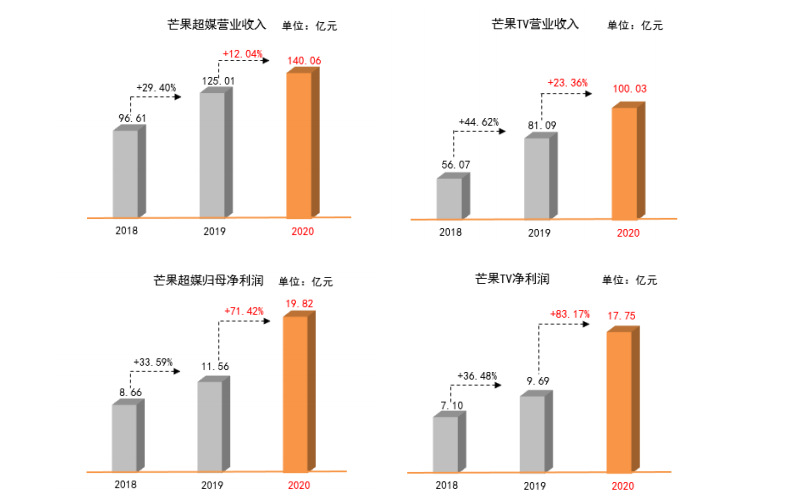 4月25日,芒果超媒2020年度报告露面,全年超140亿的营收,19.82亿的利润,宣告了其千亿市值的底气。而作为国内唯一盈利的长视频平台,芒果TV更是十分争气,营收超100亿,盈利17.75亿,同比增长83.17%,要知道爱奇艺在2020年的净亏损是70亿,而备受关注的小破站去年的亏损也达到了30亿。同样就在各大视频平台都在发愁会员增速放缓时,芒果TV依旧逆势生长,截止2020年底,其有效会员数3613万,同期增长96.68%。
