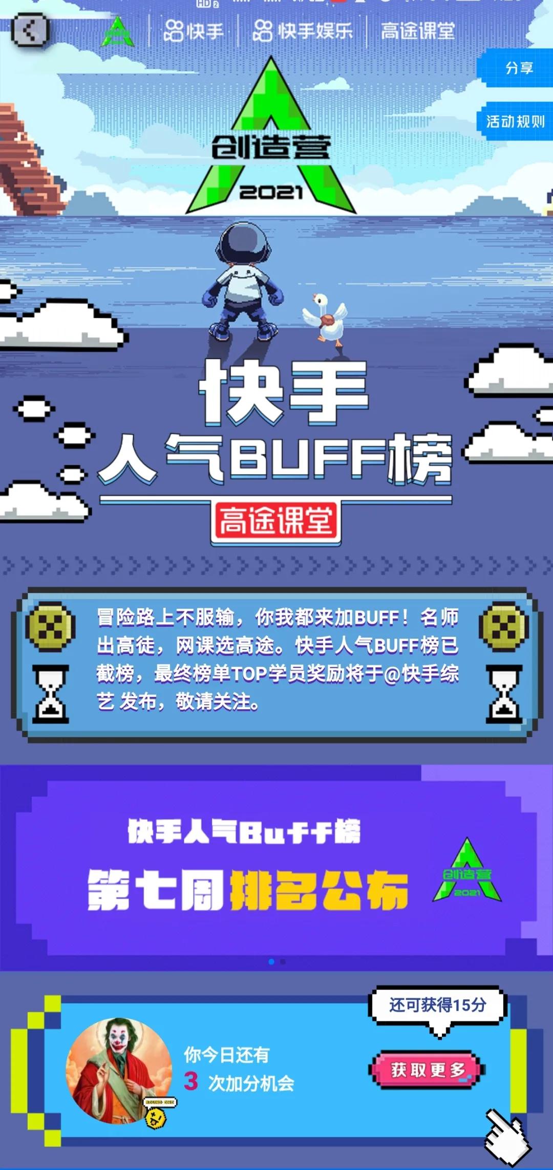 以《创造营2021》为例,在节目前期,快手完成了快手人气BUFF榜站内的产品运维和学员全员入驻的短视频策划,并针对用户的使用情况进行了更新迭代,促使老铁们逐渐了解节目并沉浸入闯人的世界。