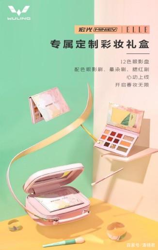 五菱宏光 MINIEV与《ELLE世界时装之苑》推出马卡龙春日炫彩礼盒,内含甜心红颜十二色眼影盘及马卡龙色系定制眼影刷。