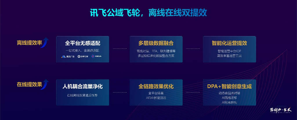 讯飞公域增长飞轮具备六大核心能力:全平台无感适配、多层级数据融合、智能化运营、以及人机耦合流量净化、全链路效果优化和DPA+智能创意生成,实现离线和在线链条效率和效果的双提升。