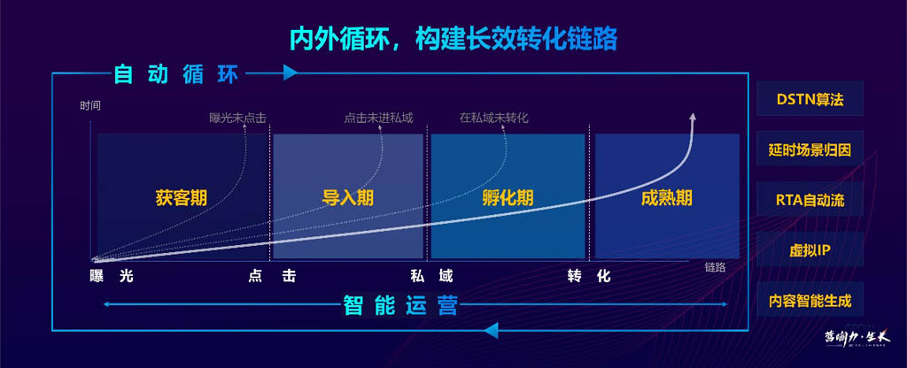 通过总结用户在互动链路中对内容注意力的规律,并融合时间互动轨迹、空间场景变化、和人群特征信息,应用DSTN-I算法对全链路进行持续的过程优化,从而提升推荐内容的精准性和多样性。在公域投放流程中,通过延时跨平台归因、DATN-Online算法和内容的序列化演绎能有效提升点击率,缩短转化周期。针对用户行为的迁移过程,针对关键行为打造用户迁移节点优化算法模型,形成泛私域自动化工作流来驱动实现持续的长效自动化运营。
