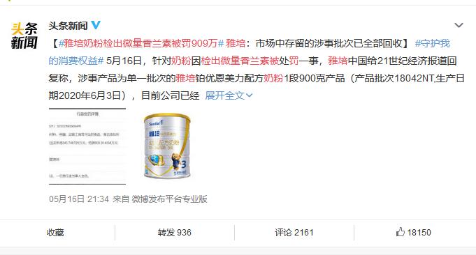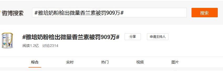 近日,雅培贸易(上海)有限公司一款配方奶粉因检出微量香兰素,而被上海市场监督管理局行政处罚,罚款金额超909万元。这是近三年国内对奶粉品牌开出的最大罚单,同时,微博话题#雅培奶粉检出微量香兰素被罚909万#登上了热搜,短时间内获得了过亿网民的关注。