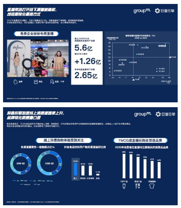 从媒介触点来看,疫情防控大背景下,这两个人群的线上消费进一步提升。相关数据显示:76.2%的食品饮料用户偏好线上消费;除电商外,37%的美妆护肤用户会在短视频及直播等渠道进行购买。快消品类更是直播间购买的首选品类。