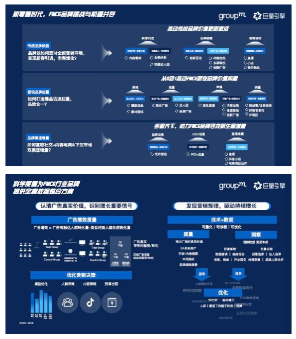 针对每个痛点,群邑和巨量引擎团队基于大量的实践经验,将巨量引擎的纷繁复杂的生态进行了细致地梳理和组合,总结了新零售时代的营销传播方法论,针对品牌新品孵化、老品破圈、渠道拓量的命题,为FMCG品牌找出三个适用于生态,可实操、可复用的解决方案,并对营销效果的衡量提出了从单波campaign到全域营销资产分析的解决方案。