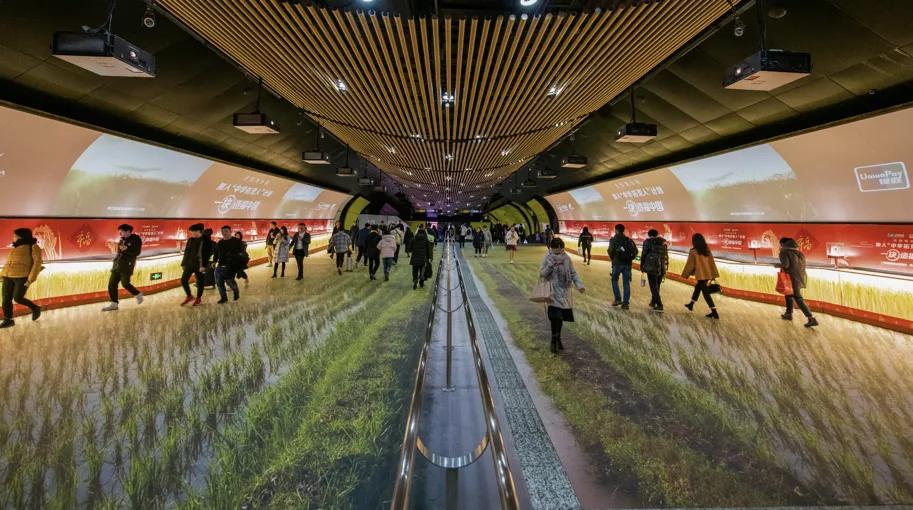 银联选择在日均客流达到40万的徐家汇三线换乘通道内布置海水稻田。通道地面采用裸眼3D式的海水稻地贴使人仿佛置身稻田之间,两侧长达23米的巨型投影,让身处钢筋丛林的乘客们走进这条通道,身心感受到田园劳动的美好。