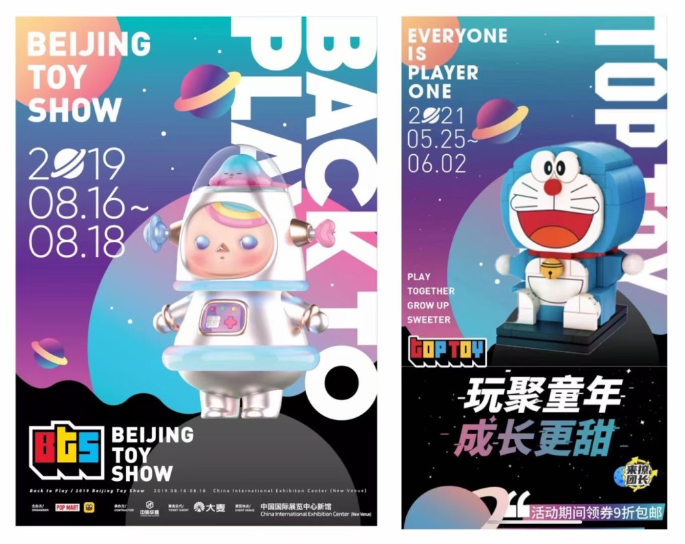 同时,该用户还配有相关图片进行佐证。配图显示,名创优品集团旗下独立潮玩品牌TOP TOY 2021年潮玩展的海报与2019年泡泡玛特BTS(Beijing Toy Show)的海报存在高度相似的情况。