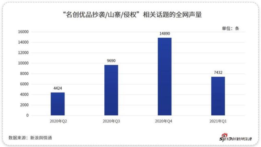 根据新浪舆情通2021年4月发布的报告,有关名创优品抄袭、山寨、侵权等相关话题在全网持续引发热议,尤其2020年10月至12月(2020年第四季度),全网相关声量最高。