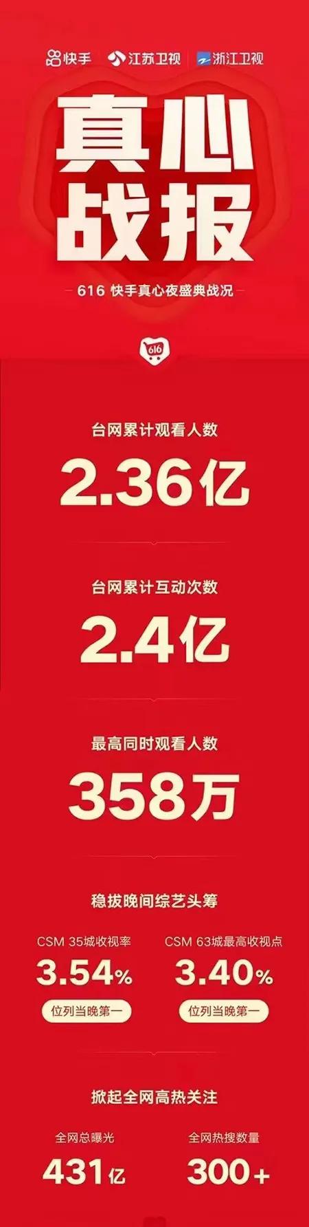 去年我们的目光还聚焦在短视频平台对长视频领域的进攻和试水,而如今的电商晚会和日常的带货直播似乎征兆着短视频平台的全领域进军。从“真心夜”官方发布的收官战报来看,晚会台网累计观看人数达到2.36亿、全网热搜超过300个,相比两大领域头部力量联手的湖南卫视“天猫开心夜”六网收视第一、320+全网热搜,快手与一线卫视的此次合作可以说也是取得了相当不错的成绩。这对其他行业来说,是来自新起之秀的严峻挑战,也是跳出舒适圈自破自立的激励。