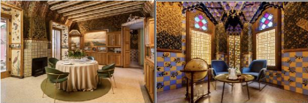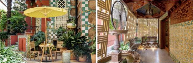 众所周知,高迪擅长将自然融入到设计中,当地常见的植物,常以奇妙的方式被收入建筑,文森之家亦彰显了这一特色。比如房子周边常见的棕榈树,就被“复制”到了铸铁大门、栏杆和窗户上。在这座花园别墅里,地中海风情的植物花纹也被大胆融入到了建筑中。小花园里的棕榈树、龟背竹、攀缘植物等一起构建出自然与建筑交融的独特空间。穿过花园就是镂空金色百叶窗围出的休憩空间,这里阳光通透,呼吸畅快,黄绿色瓷砖和繁盛植物花纹无处不在,让人感受到夏日满满的活力。