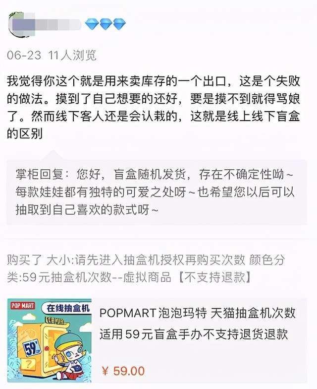 AI财经社还发现,在泡泡玛特天猫旗店,早就玩起了在线抽盲盒,最低59元抽一次,不支持退款。消费者下单后,选择喜欢的系列进行在线抽盒,仓库按所抽取商品发货。因为泡泡玛特单笔实付89元才包邮,所以此款商品还要另付7元运费。