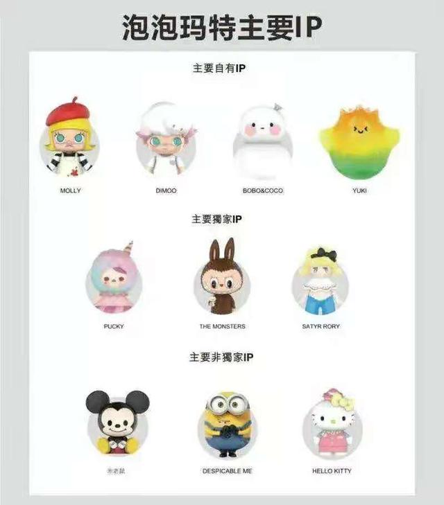 截至2020年6月30日,泡泡玛特共拥有93个IP,包括12个自有IP、25个独家IP及56个非独家IP。其中,Molly是如今泡泡玛特最成功的IP,由香港设计师王明信2006年设计而成,后泡泡玛特创始人王宁与其签下独家授权。