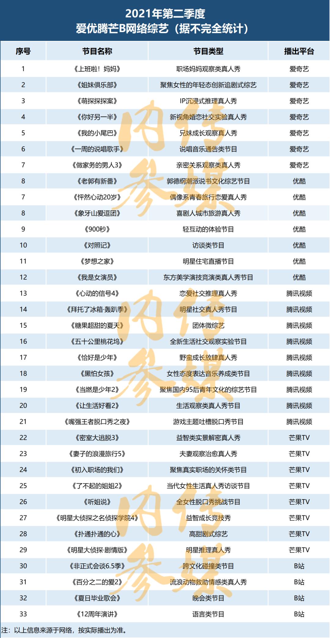 传媒内参独家梳理了今年第二季度上新的网综项目,从数量上来看,33档+的体量,几乎与去年同时期基本持平,但变化明显的是,相较于去年由于疫情影响,视频网站平台多产出的是小体量云综艺,今年二季度网综明显更加“加码增值”,大都上马了中、大型体量的综艺项目,彼此之间竞争的火药味也颇浓。