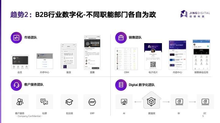 在数字化转型启动之前,企业的数据维度往往较为单一,而在数字化转型之后,企业需要提供给客户完整的体验,首要工作就是整合数据、打通数据孤岛。而洪锴认为,不仅仅是数据打通,工作流程等也都要进行打通,以便实现最好的转化结果。相应地,部门之间的界限也会被重新定义。典型例子如前所述,市场部与销售部门的藩篱会逐步消失:市场部掌握大量的触点,积累的数据越来越多,如何去给前端赋能?销售部的数据如何回流到市场部的主数据库里去补充画像?
