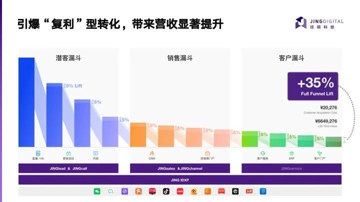 简单来说,IDXP 帮助市场部和销售部解决了获客以及数据沉淀的问题,能够借助数据的力量覆盖全链路,看到全链路的客户表现,这样,每个触客节点都可能实现转化。