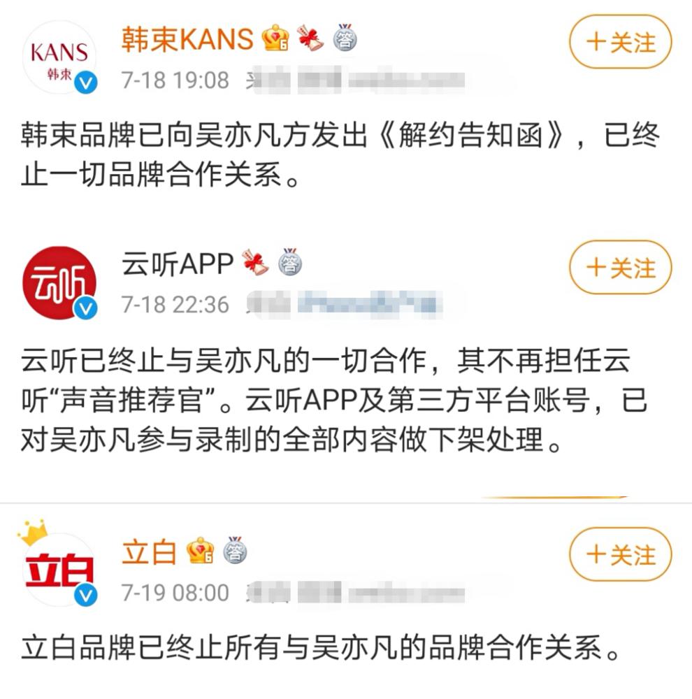 随着都美竹的发文,事件不断发酵,吴亦凡的事业也受到不小冲击。截止到目前为止,已有多家品牌终止了与吴亦凡的合作,包括云听APP、立白、良品铺子、韩束等品牌都终止了与吴亦凡的合作,除此之外,有多家品牌方也删除了有关吴亦凡的动态。