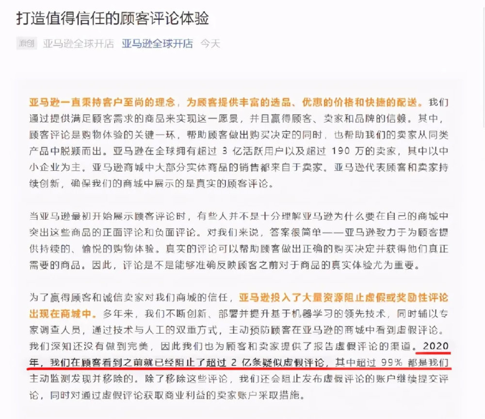 据官方数据,2020年,亚马逊通过技术和人工手段阻止了2亿条疑似虚假评论;每到大促销时期还会封杀一些有此类行为的店铺,杀鸡儆猴。