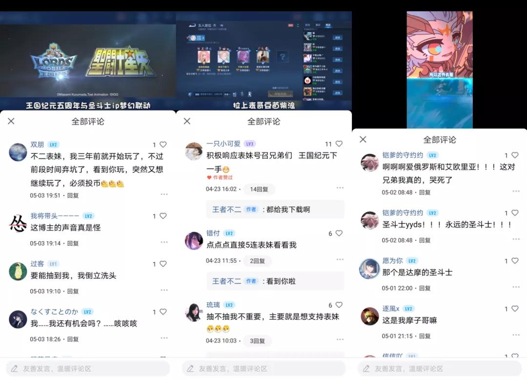 游戏以达人定制视频为主打素材,像是从《王者荣耀》的圣斗士皮肤,过渡到《王国纪元》与圣斗士联动的宣传创意,利用有影响力的KOL、有契合受众的主播,产出相应主题的定制视频。