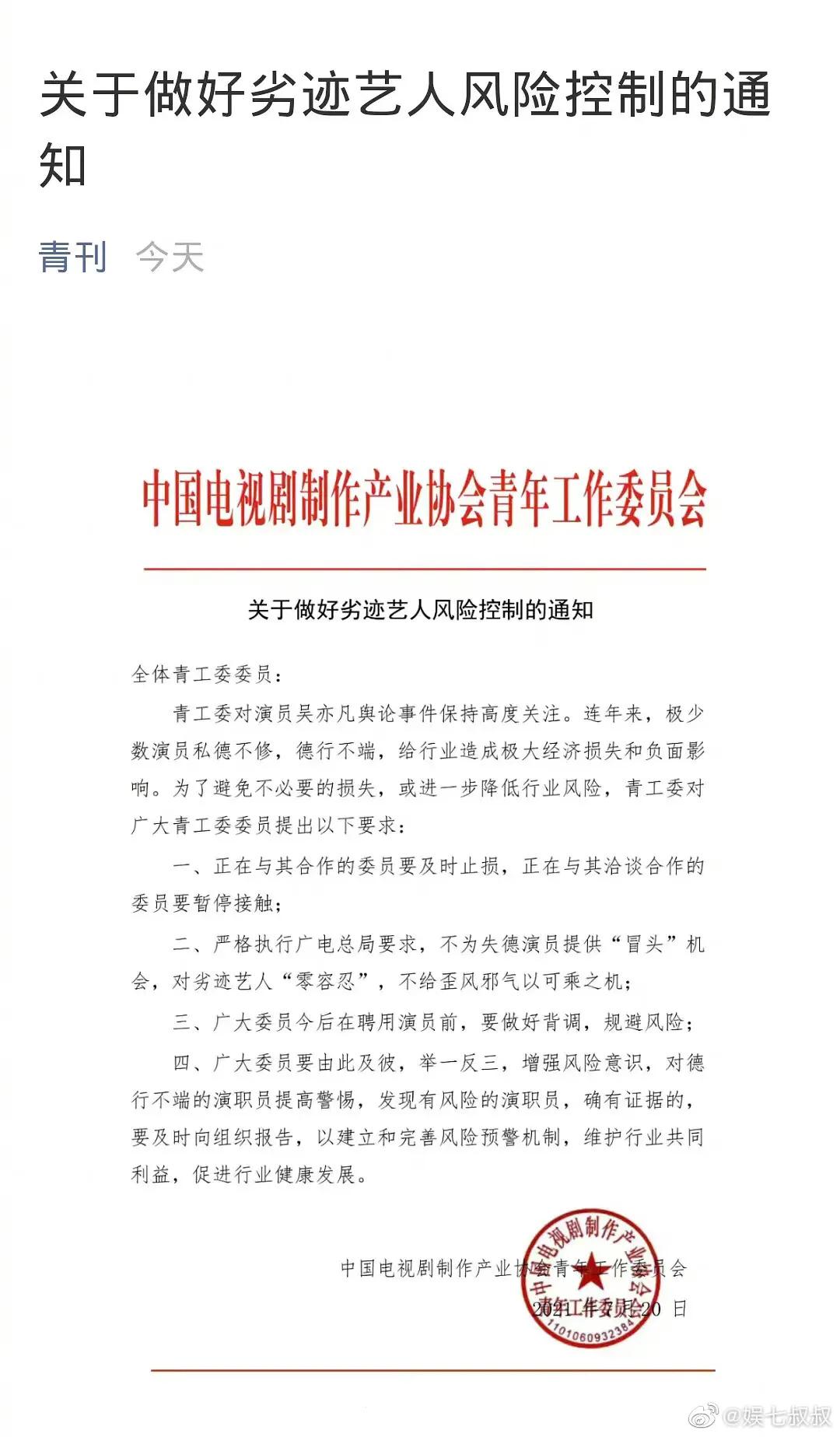 7月20日,中国电视剧制作产业协会青年工作委员会发表文件,谈到有关劣迹艺人风险控制相关事宜,并直接点名吴亦凡。