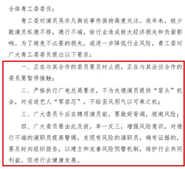 该文件里写道如今极少数演员私德不修,德行不端,给行业造成了极大的经济损失和负面影响。为了避免不必要的损失,降低行业风险,提出了四点要求。