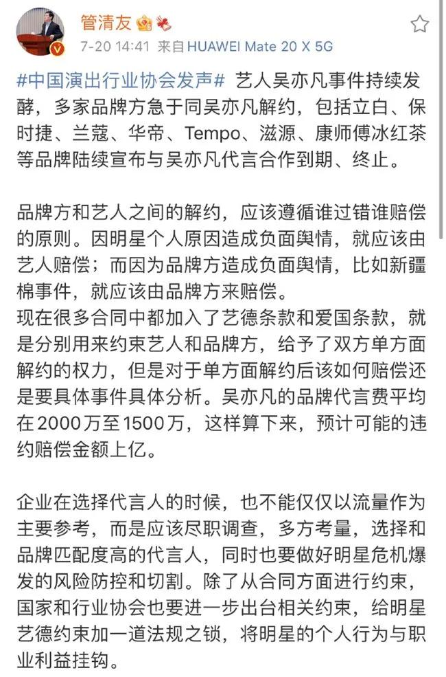 不仅如此,根据经济学家管清友总结的内容,吴亦凡的品牌代言费平均在2000万至1500万,这样算下来,14个代言预计可能的违约赔偿金额上亿。
