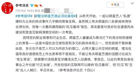各大官媒也谈到此事的严重性,《参考消息》直接发文,称整治明星艺德必须动真格。
