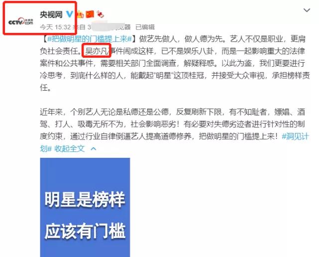 央视也正式发声,点名吴亦凡,称要“把做明星的门槛提上来”,还特意将此条动态置顶。