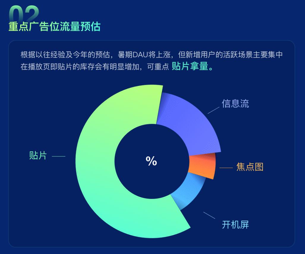 根据爱奇艺奇麟暑期投放攻略的预估,播放页的贴片广告将成为新增用户贡献的主要广告库存资源。在暑假期间,贴片广告的占比在所有广告形式中将超过一半,这源于观看电影、剧集和综艺是人们假期最主要的休闲方式,这种类刚性的需求保证了库存的充足供应。因此,企业需要对贴片广告资源予以更多的重视。