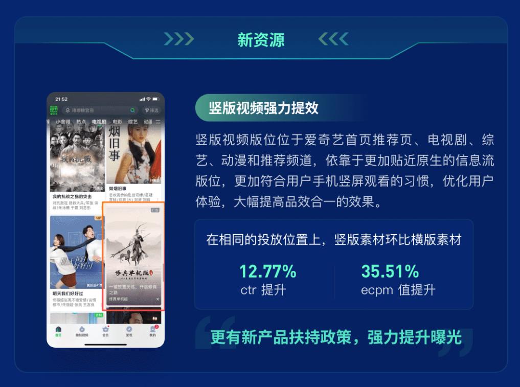 根据爱奇艺奇麟发布的数据显示,在相同投放位置上,竖版素材相较横版在点击率和eCPM值上分别提升12.77%和35.51%。这种类似A/B test的科学度量,强有力地证实了竖屏版位资源的效果,所以同样值得企业重视。