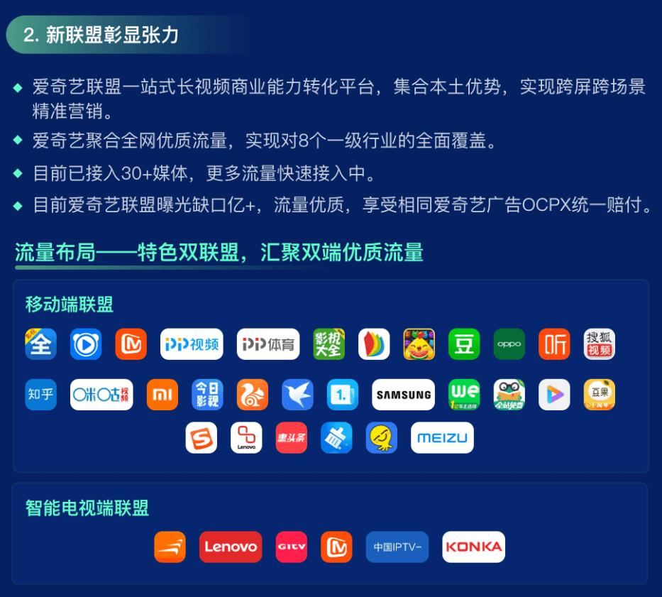 尤其值得注意的是,与其他联盟类产品略有不同,爱奇艺联盟更重视试听资源和跨屏优势。比如其建立了双联盟的架构,既与大量头部移动应用和手机生产商组建了移动端联盟,同时也与电视厂商和广电系统搭建了智能电视联盟。