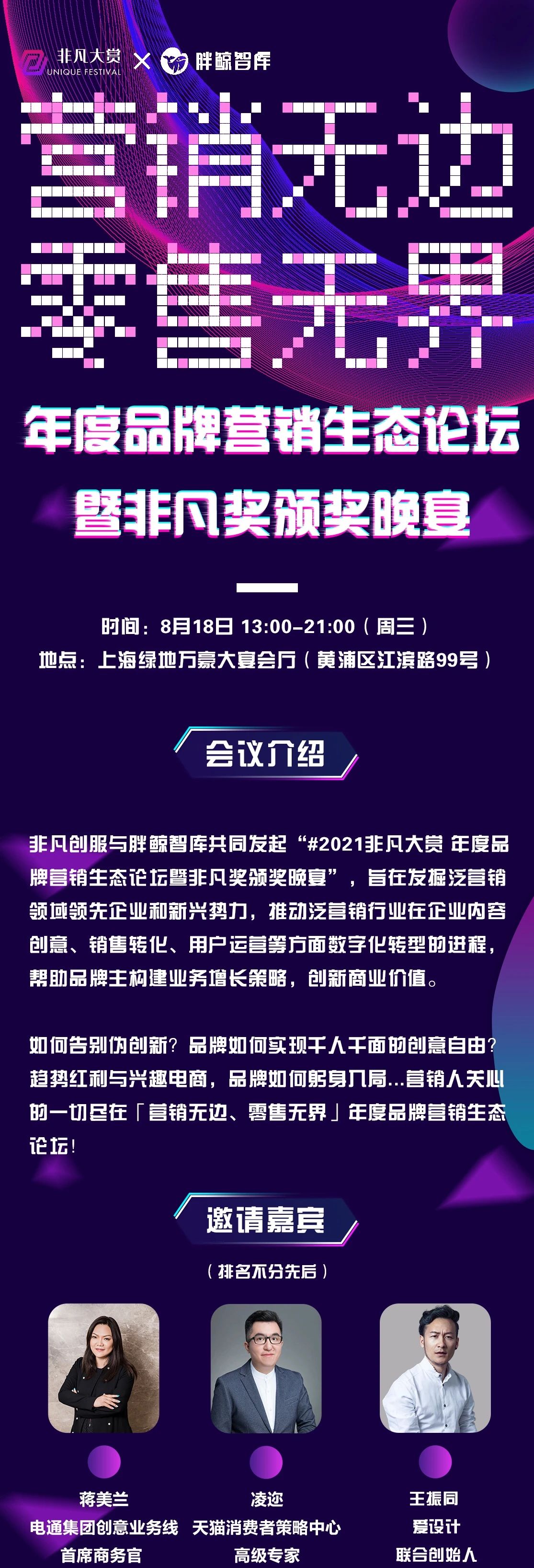 非凡创服与胖鲸智库共同发起“#2021非凡大赏 年度品牌营销生态论坛暨非凡颁奖晚宴”,旨在挖局泛营销领域领先企业和新兴势力。