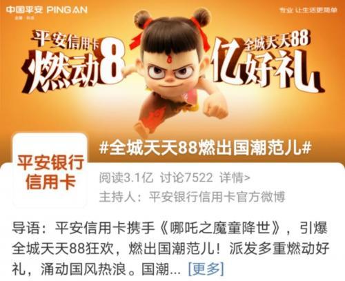紧接着,平安银行信用卡又趁热打铁,通过官博发布结合哪吒形象打造的利益点海报,以绑定哪吒形象与品牌主张的文案延伸情感触点,在国潮范的内容表达中,放大品牌传播感染力,聚焦用户关注,点燃消费热情。