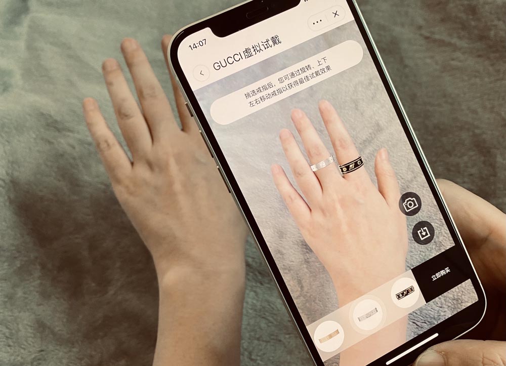 GUCCI古驰也在七夕首度将珠宝品类放到天猫官方旗舰店售卖,并同步上线了手部AR虚拟试戴,消费者可在天猫便捷地试戴经典双G手镯、Icon系列宝石戒指等商品,还可定制礼品卡。