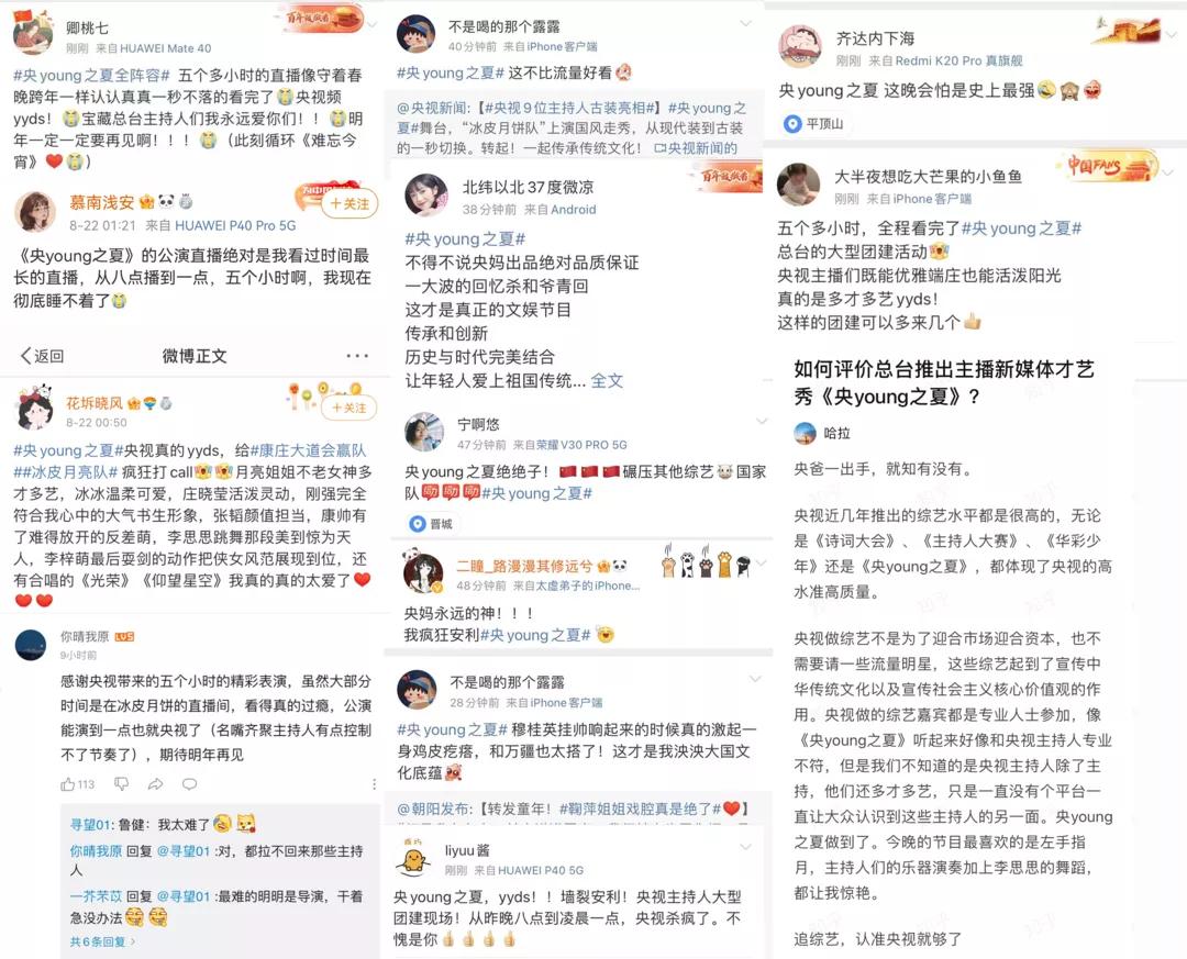 在评论中,许多网友不吝赞誉:“好喜欢看央视主持人花样团建!才艺多多,欢乐多多!”“多才多艺,能文能武,不愧是国家队!”“被《央young之夏》惊艳到了”“看哭了,央视yyds”。更有网友表示:“这才是真正的文娱节目,传承和创新,历史与时代完美结合”!