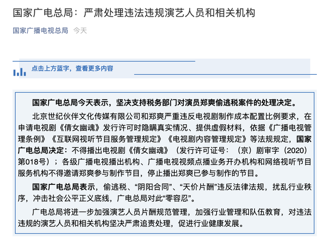 国家广电总局今天表示,坚决支持税务部门对演员郑爽偷逃税案件的处理决定。
