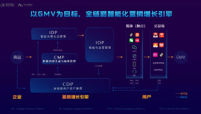 讯飞提出打破以“交易场”为中心的主流营销模式。讯飞坚持以增量价值为导向,围绕“TA”架设增长引擎。具体来看,讯飞以智能决策平台IDP、智能运营平台IOP、内容管理平台CMP和用户管理平台CDP四大核心模块构建增长引擎。尤其是针对“公域和泛私域”两大增长飞轮驱动,帮助企业拓展交易场外的新增量。