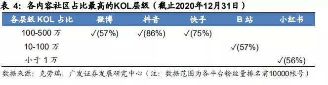 而对比微博、抖音、快手和B站,小红书的KOL结构还处万粉小博主遍地跑的局面。