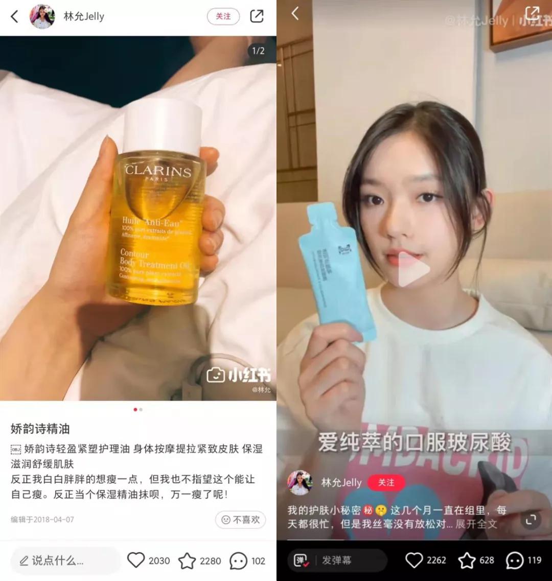 一些明星也开始走亲民路线,一边接着三线品牌的广告,一边和贫民窟女孩们套近乎,在林允早期的恰饭笔记中,我们还能看到价格在200元到700元的“娇韵诗”护肤精油,而如今,林允推荐的却是一款卖175元的“爱纯萃”玻尿酸口服液。