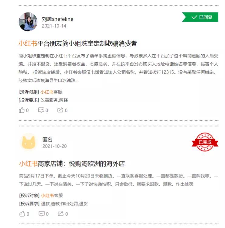 在新浪的黑猫消费者平台上,我们可以找到在“号店一体”后消费者对品牌的投诉。如售卖假珠宝品牌拒退货、快递迟迟未收货等问题。
