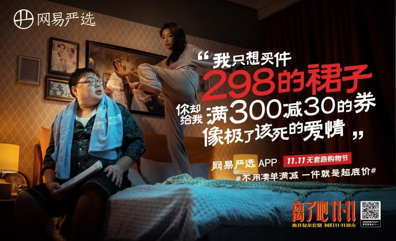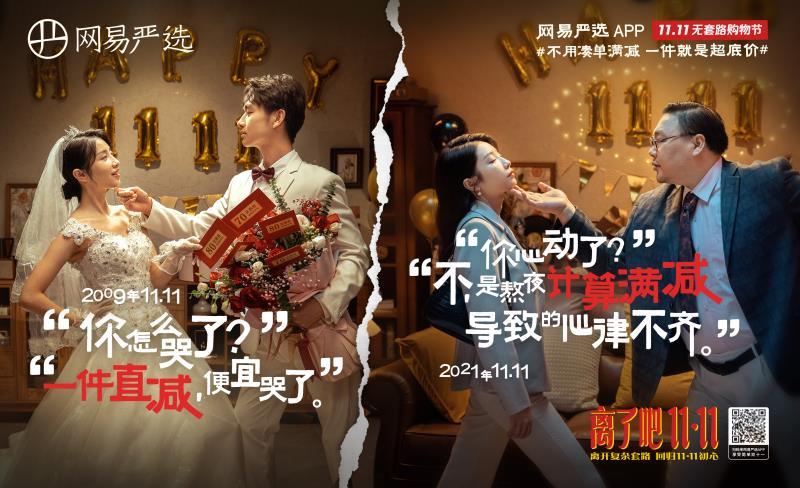 11月8日,网易严选发布了全新双11广告片《离了吧,1111》,采用诙谐幽默的拟人手法,把消费者和双11比作一对夫妻,对双11复杂的套路,以用户的角度来了一波隐射吐槽,引起了无数消费者的情感共鸣。