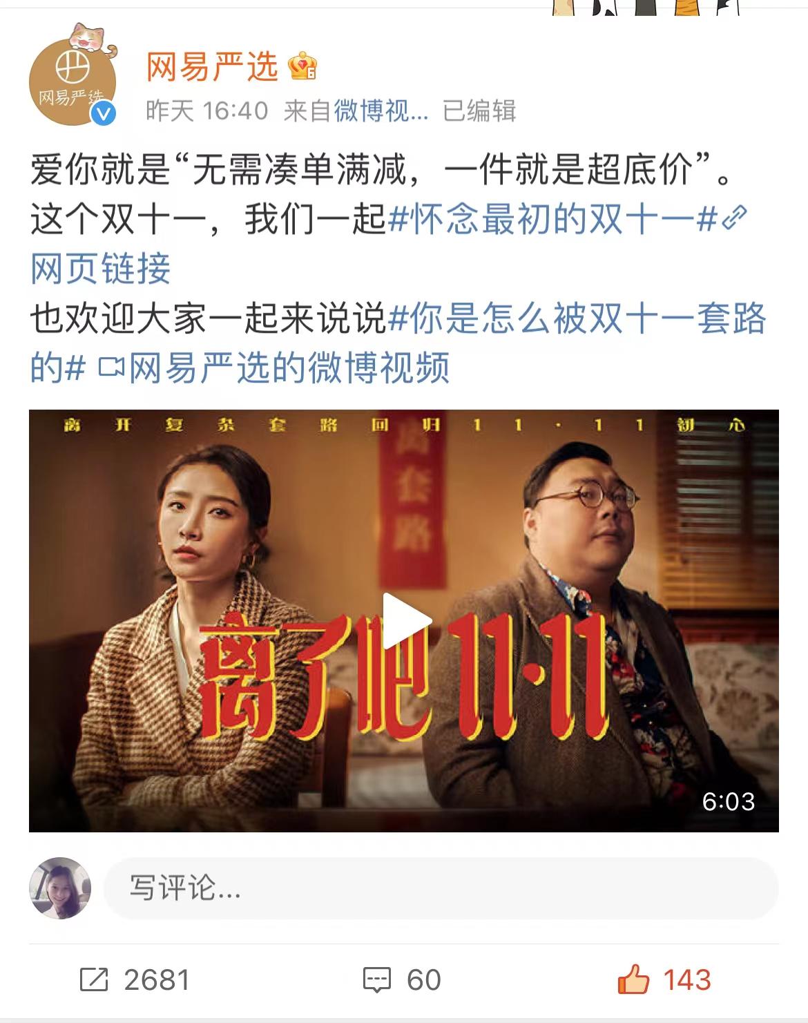 而为了能够更加深入的与用户进行沟通,网易严选还在年轻人喜欢的社交平台微博上打造了social话题#怀念最初的双十一#和#你是怎么被双十一套路的#,鼓励消费者能够尽情的发挥和吐槽,分享自己对双11套路的看法。
