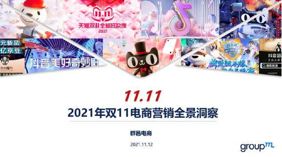 2021年《群邑电商双11电商营销全景洞察》完整版重磅发布,报告全面复盘了今年电商营销新趋势、主要类目排行榜,重点分析天猫、京东和抖音等平台玩法,并为品牌在各电商平台的增长提供了实用建议和营销指南。