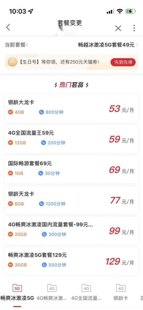 结果小雷升级套餐后,却发现当月根本无法取消,多出来的流量和花费我也不需要,想要套餐降档吧,更是做梦。我升级为49元的套餐后,所能变更的最低价格套餐,就是53元了。